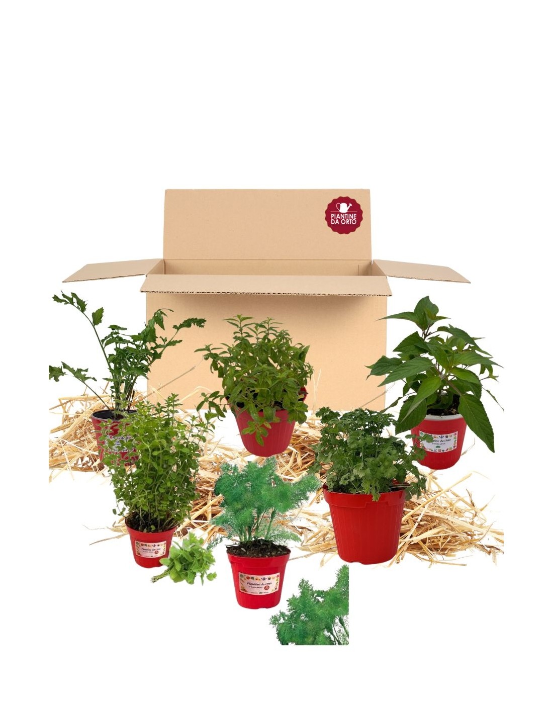 Kit orto pronto composto da Menta, Salvia ananas, Erba luigia, Ruta, Finocchio selvatico e Coriandolo da coltivare anche sul balcone di casa.